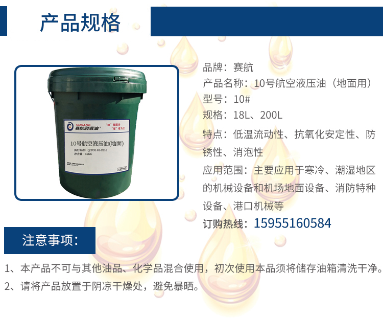 賽航10號航空液壓油(地面用)選用深度精制、深度脫蠟的優(yōu)質(zhì)低凝高品質(zhì)基礎(chǔ)油和合成油添加劑,采用國際先進(jìn)技術(shù)水平的生產(chǎn)工藝調(diào)合而成。10號航空液壓油(地面用)主要用作各種要求較高液壓系統(tǒng)的工作液、機(jī)場地面的各種液壓機(jī)械設(shè)備以及嚴(yán)寒地帶。譬如數(shù)控機(jī)床、高壓乙烯輸送泵、乙醇胺循環(huán)泵、船舶起重機(jī)、挖掘機(jī)、甲板機(jī)械、起錨機(jī)、雷達(dá)車、大型吊車以及電器開關(guān)等。