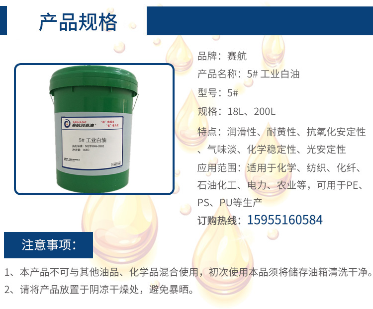 用途∶ 白油用于潤(rùn)滑油加工生產(chǎn),日用化妝用品、紡織化纖平滑劑用油、鋁材加工、橡塑增塑、合成油基礎(chǔ)油、塑料母料用油、縫紉機(jī)油,塑料編織袋用油等。白油可用于防粘、脫膜、消泡、密封、拋光和制藥機(jī)械的防腐潤(rùn)滑等。