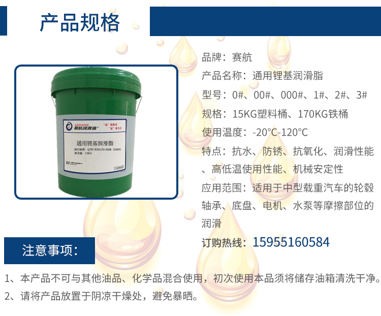 賽航通用鋰基潤滑脂以高級脂肪酸鋰皂稠化III類加氫油,并加入多種高效添加劑精制而成。具有良好的抗水、防銹、抗氧化和潤滑性能,優(yōu)良的高低溫使用性能和機械安定性,是一種多效長壽命潤滑脂。適用于中型載重汽車的輪轂軸承、底盤、電機、水泵等摩擦部位的潤滑,也適用于各種機械設(shè)備的滑動、滾動摩擦部位的潤滑。使用溫度范圍:-20℃—120℃。